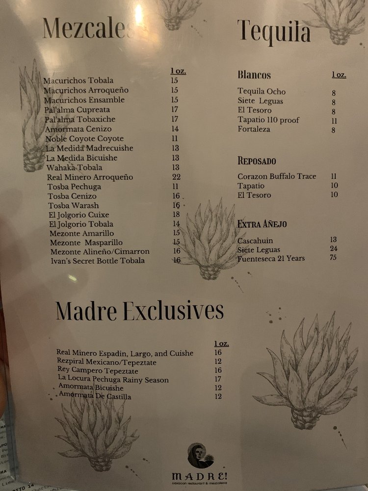 Madre's drink menu is equally enticing, featuring standout margaritas and handcrafted mezcal cocktails that enhance the dining experience. Their outdoor seating and dog-friendly policy make it a delightful spot for all. Whether you're in for dinner, brunch, or a spirited happy hour on Saturdays, Madre warmly welcomes everyone, ensuring attentive service along the way.